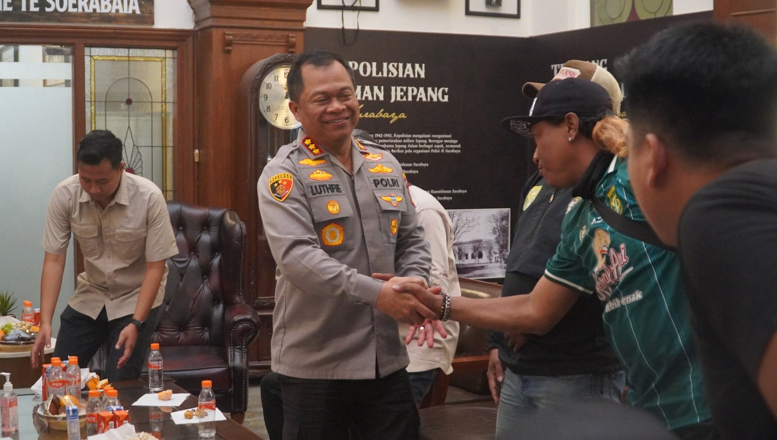 Kapolrestabes Surabaya, Kombes Pol Luthfi Sulistiawan, menerima kunjungan dari aliansi masyarakat Surabaya yang menyatakan sikap tegas dalam deklarasi damai, Selasa (2/8/25).
